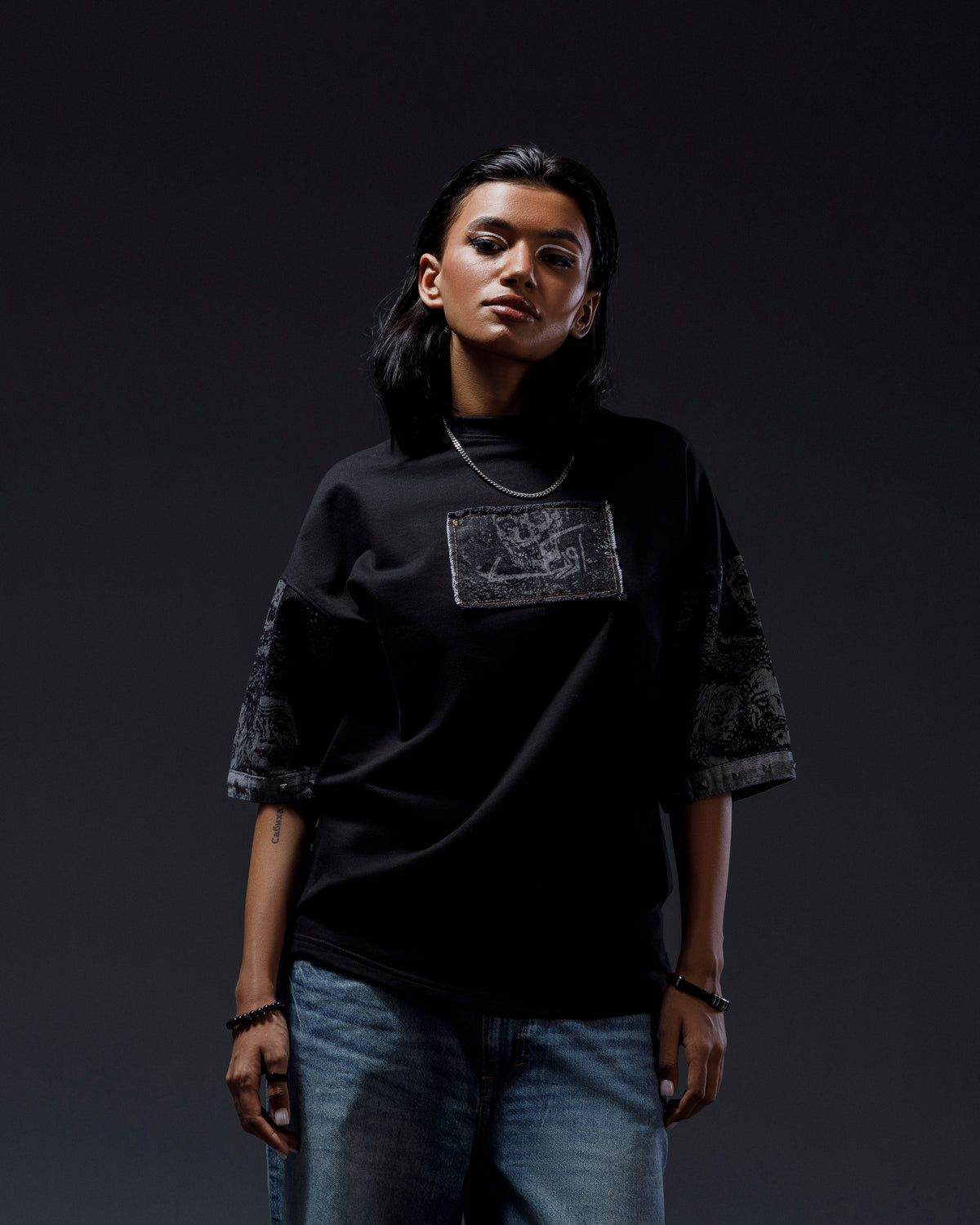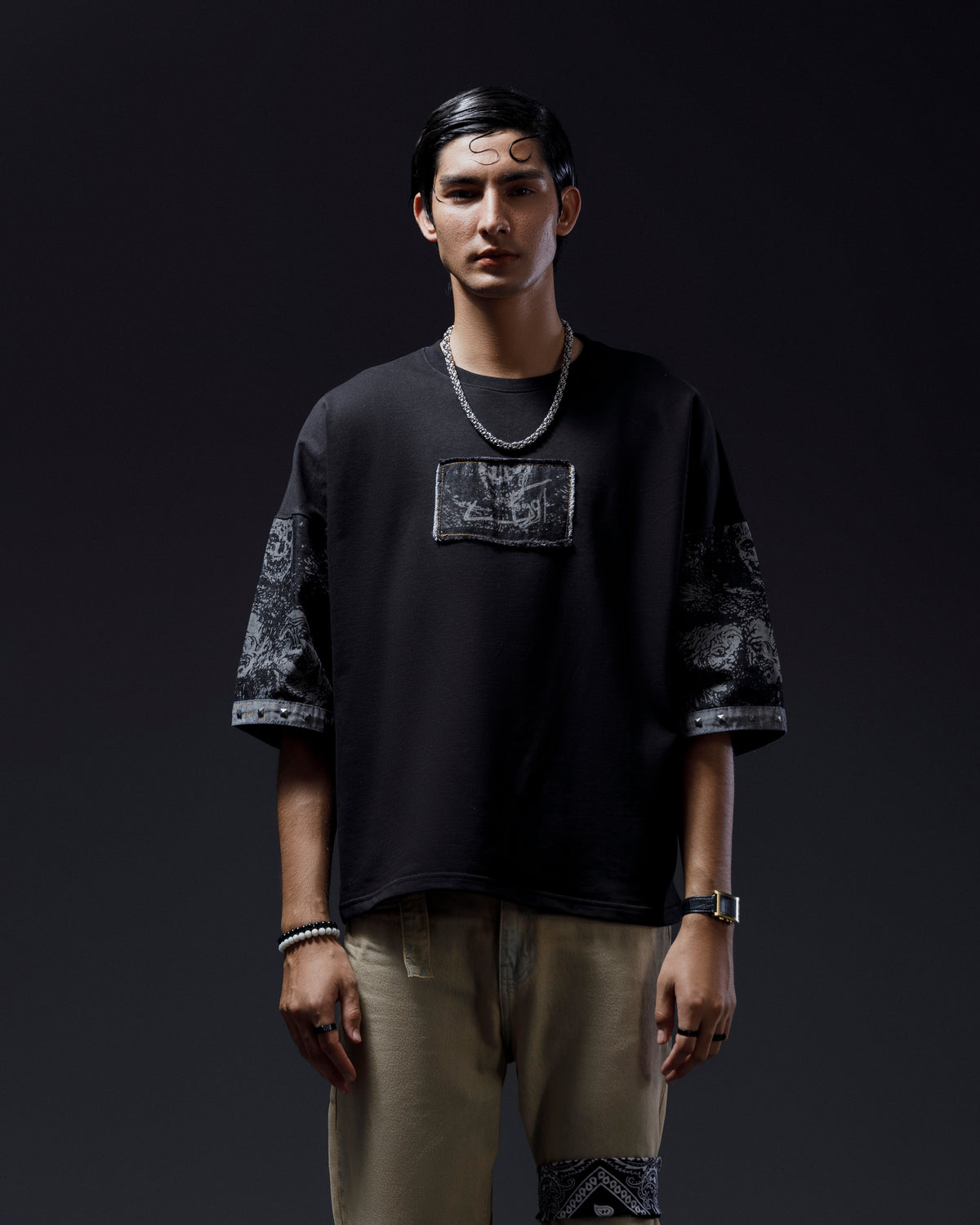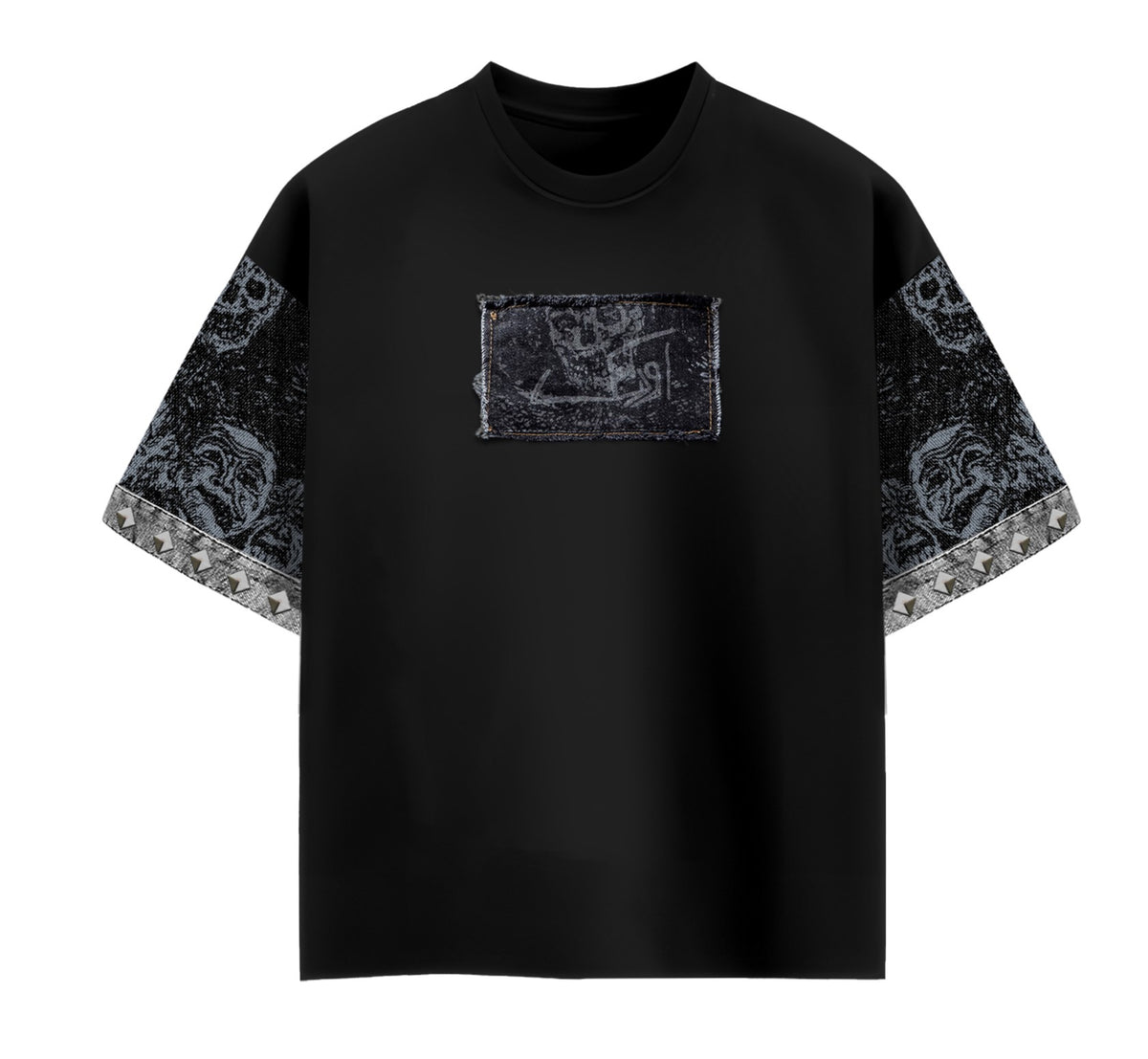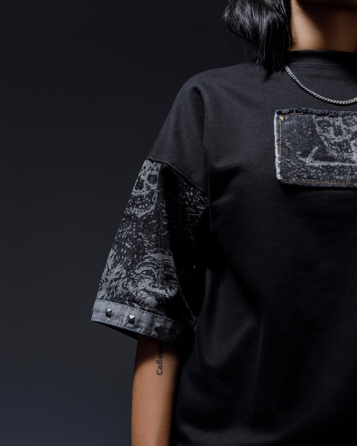 Design Details: Black tee with denim smoky sleeves, metal-studded cuffs, a back print, and a front logo patch.