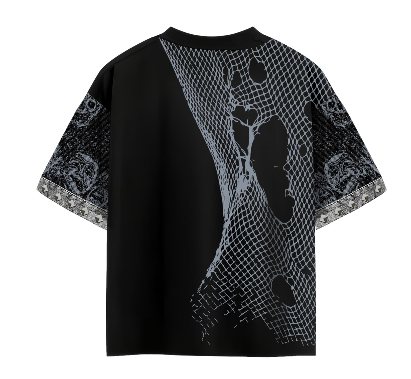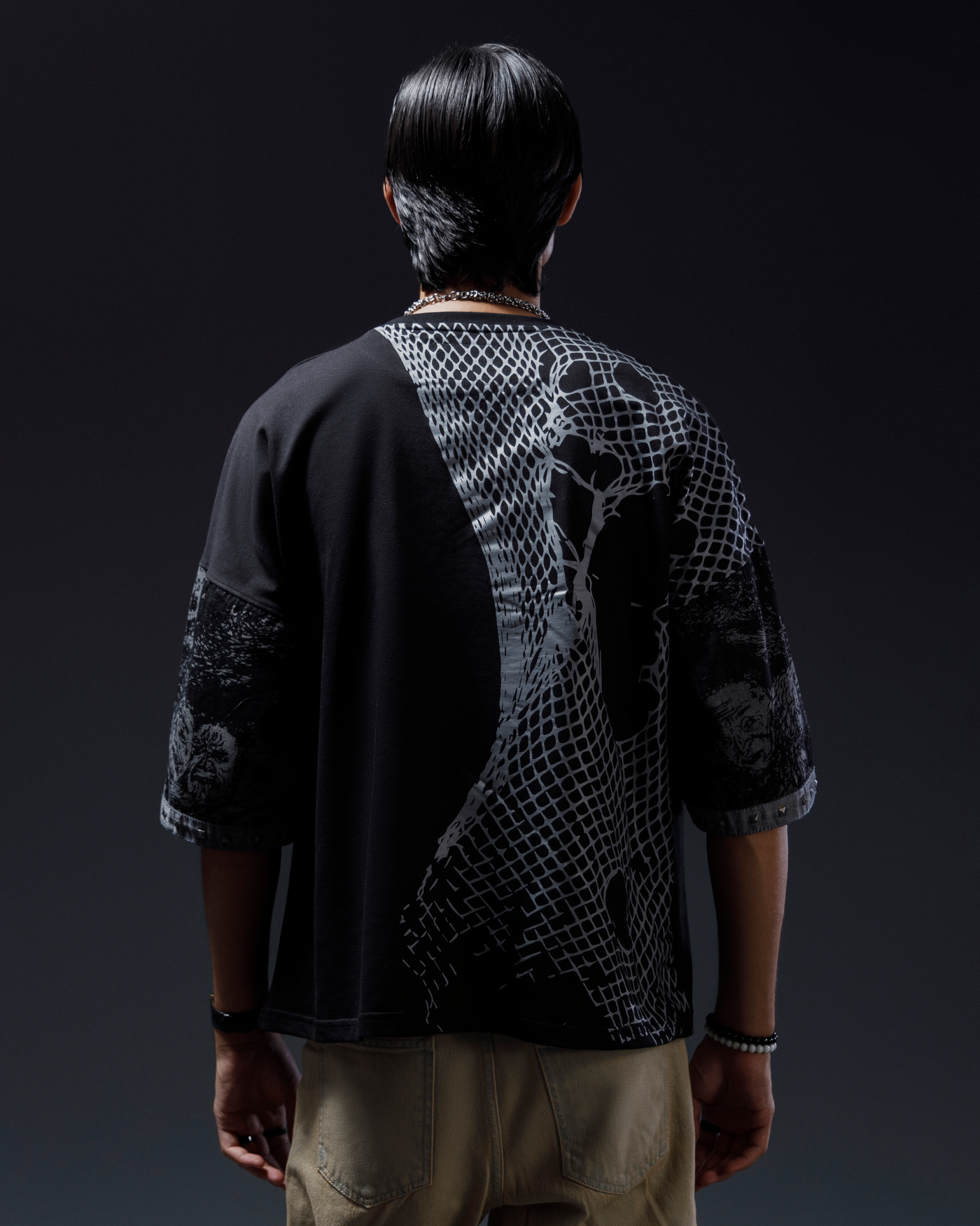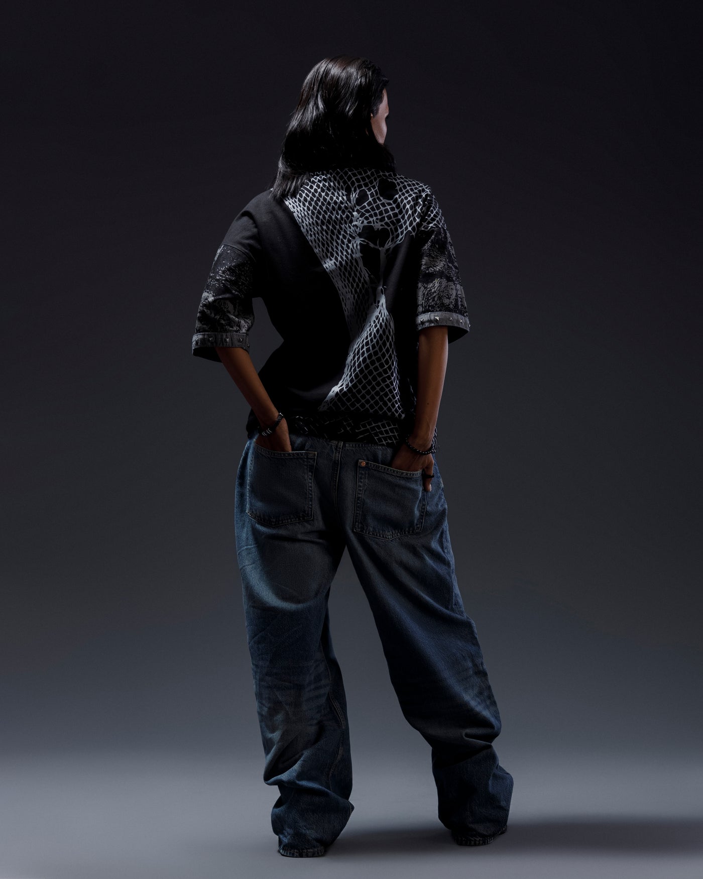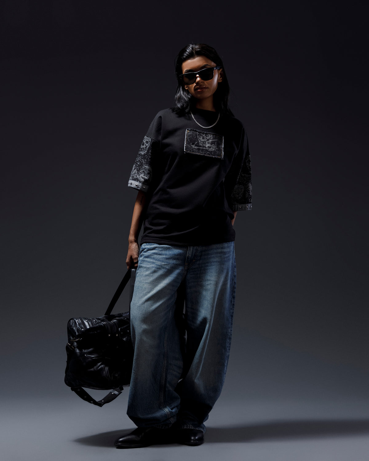 Design Details: Black tee with denim smoky sleeves, metal-studded cuffs, a back print, and a front logo patch.